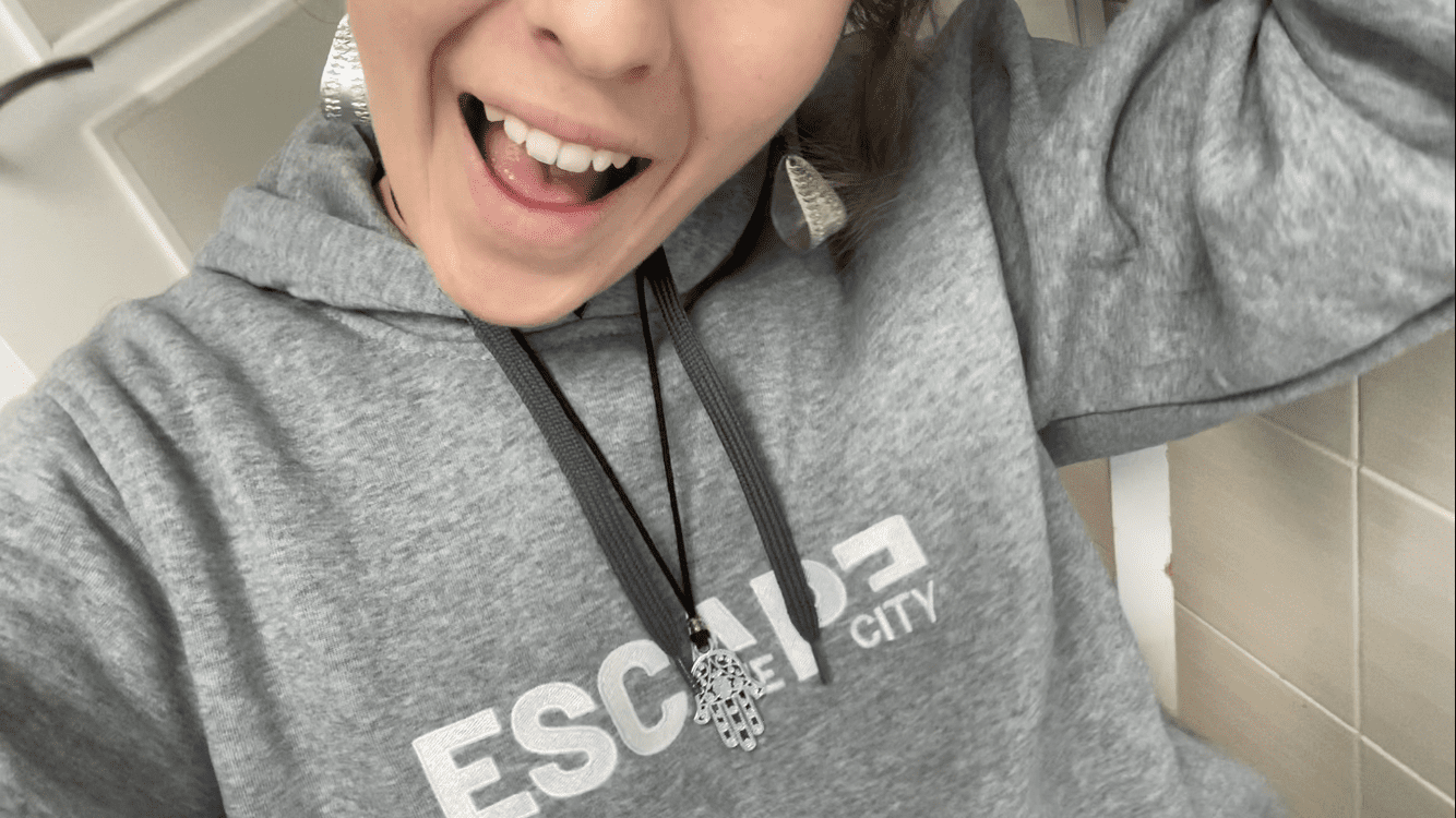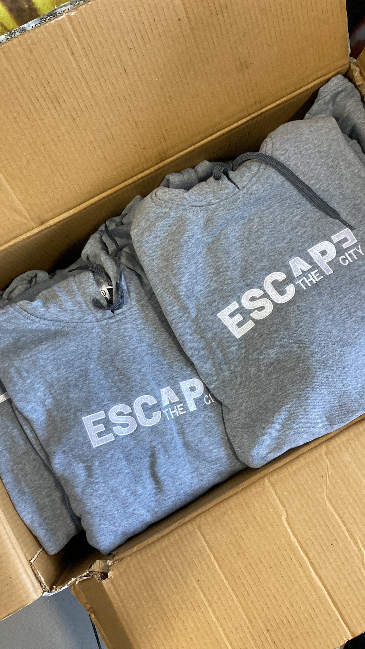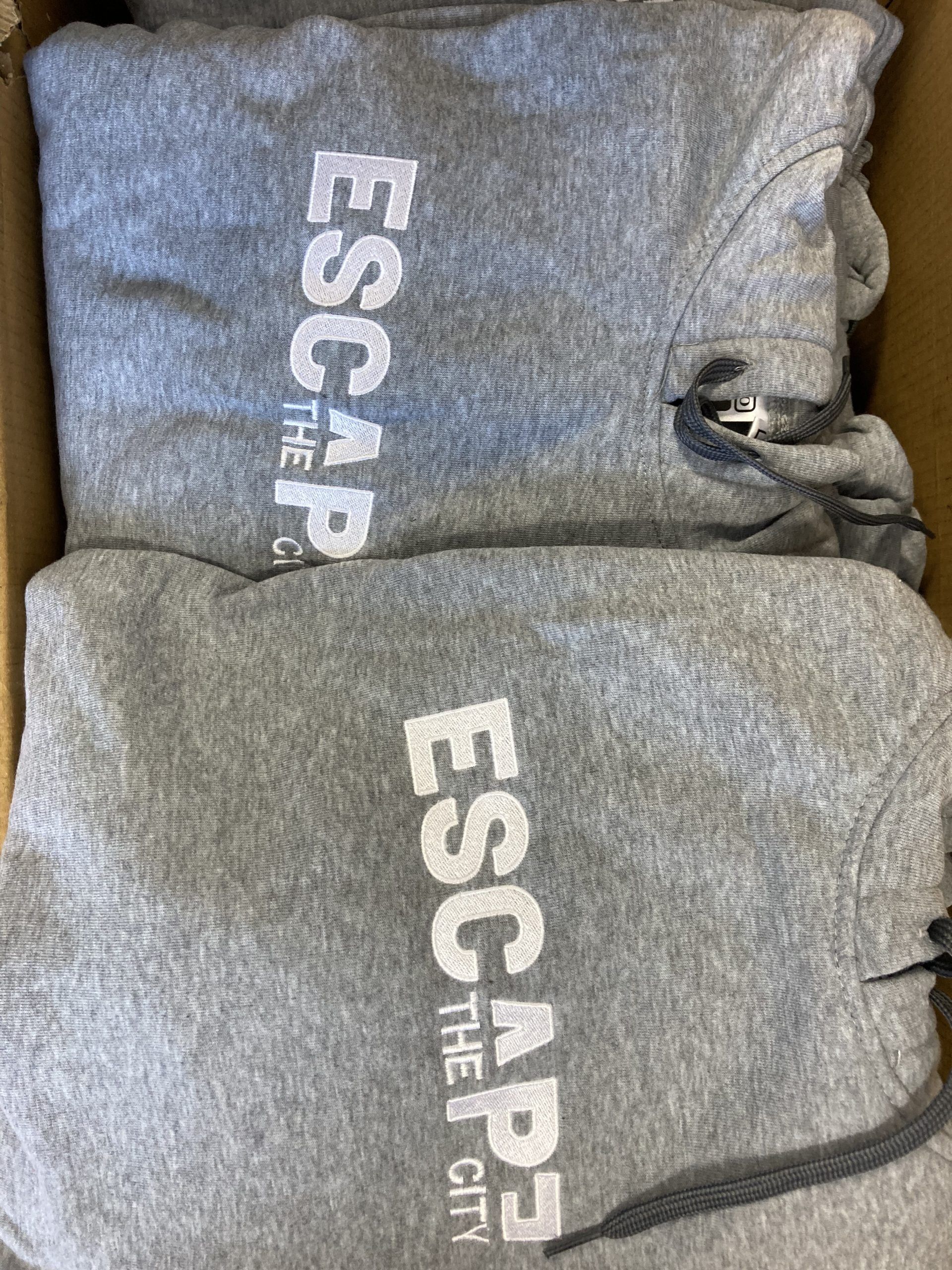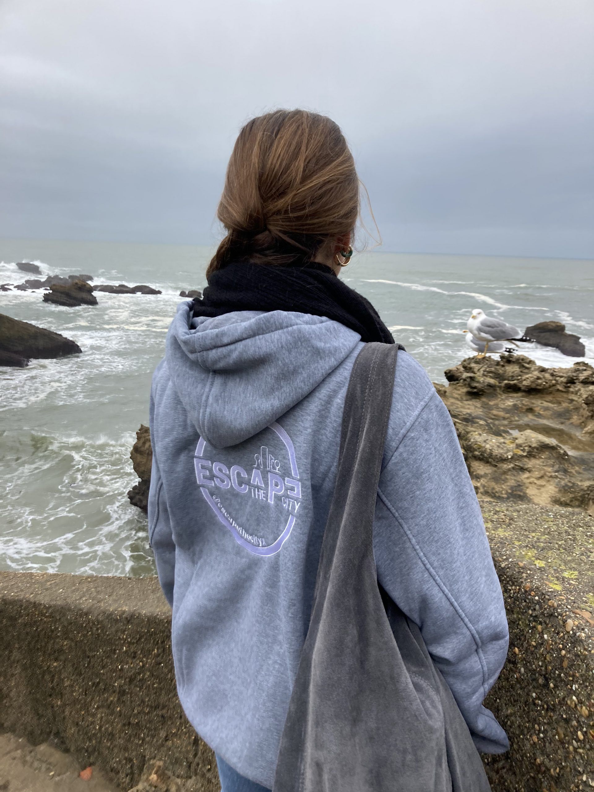 Sudadera gris con capucha, bolsillo central y tiras colgantes. Cómoda y calentita, ¡perfecta para escapar!.